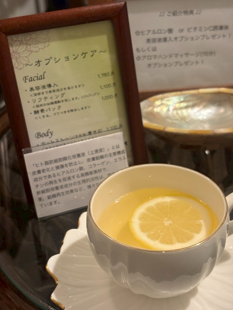 | *導入(ビタミンC誘導体orヒアルロン酸美容液) 1760円(10分) *リフティング(筋肉の収縮運動を促します) 1100円(7.8分) *酵素パック(くすみ、ゴワつき除去) 1210円(15分) 上記のオプションの時間は目安です |